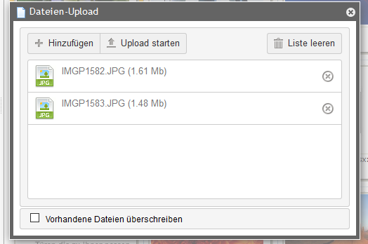Die Dateien können über einen Upload-Dialog hochgeladen werden, oder einfach per Drag-and-Drop!