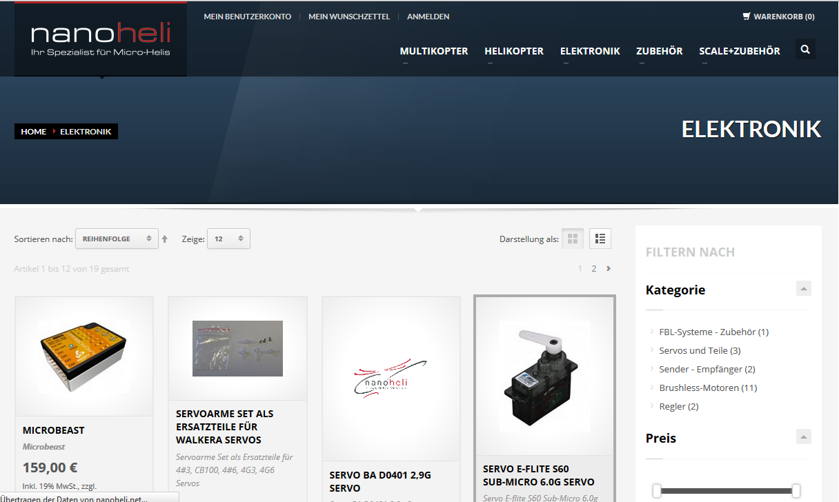 Moderner mobil-freundlicher WebShop für Nanohelis, Drohnen und andere fligende Objekte