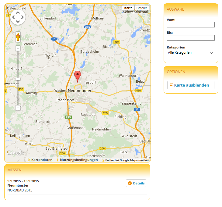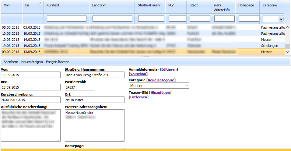 Aquí puede añadir y editor todos los eventos y categorizarlas. Imágenes previas, descripciones y por supuesto, la dirección exacta. Todo eso puede gestionar aquí. Todos los eventos se pueden filtrar y activar o desactivar.