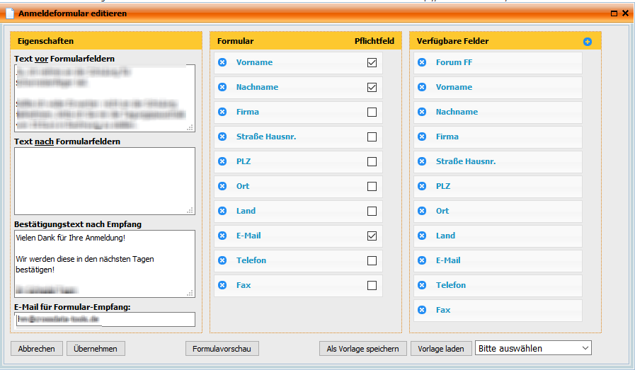 Con el Gestor de formularios puede crear rápidamente un formulario para que los usuarios se puedan registrarse o inscribirse a sus eventos. Estos registros se pueden enviar automáticamente a una dirección definida.